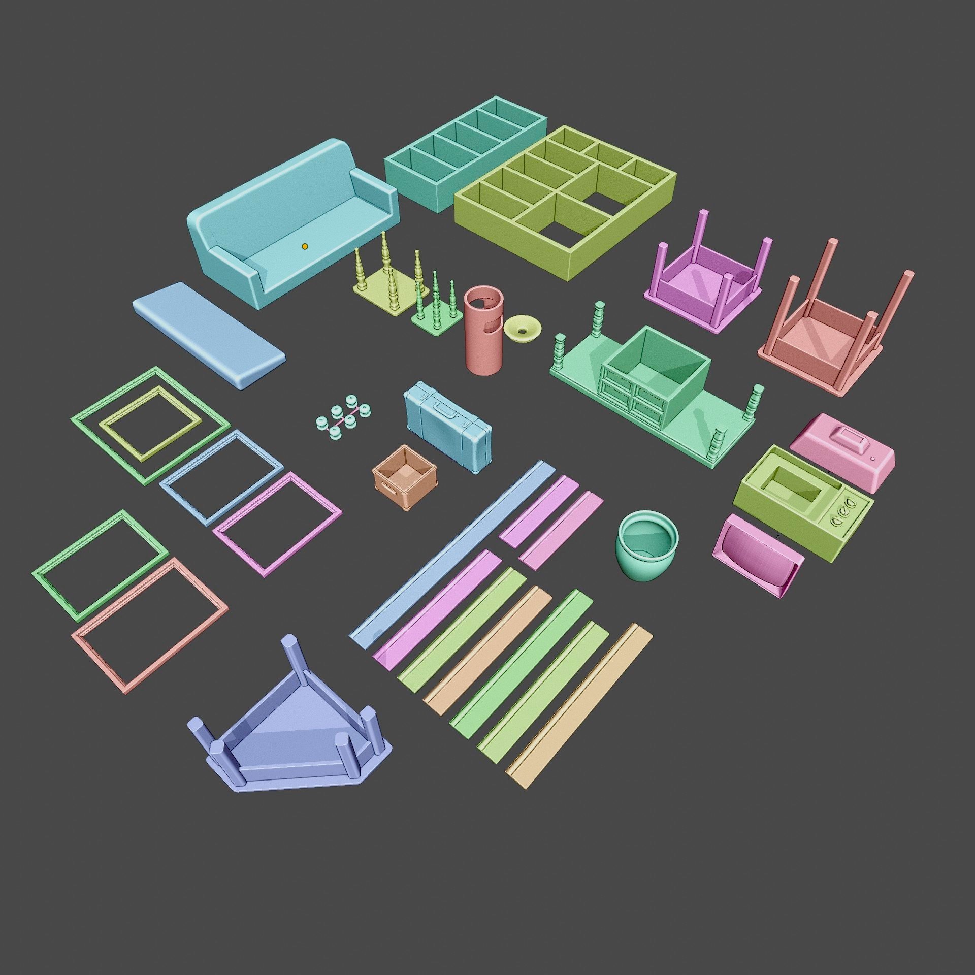 This project used a mix of skills that my wife and I have, including modelling, 3D printing, painting, laser cutting and some minor electronics for lighting. You can see the collection of models used for 3D printing below.